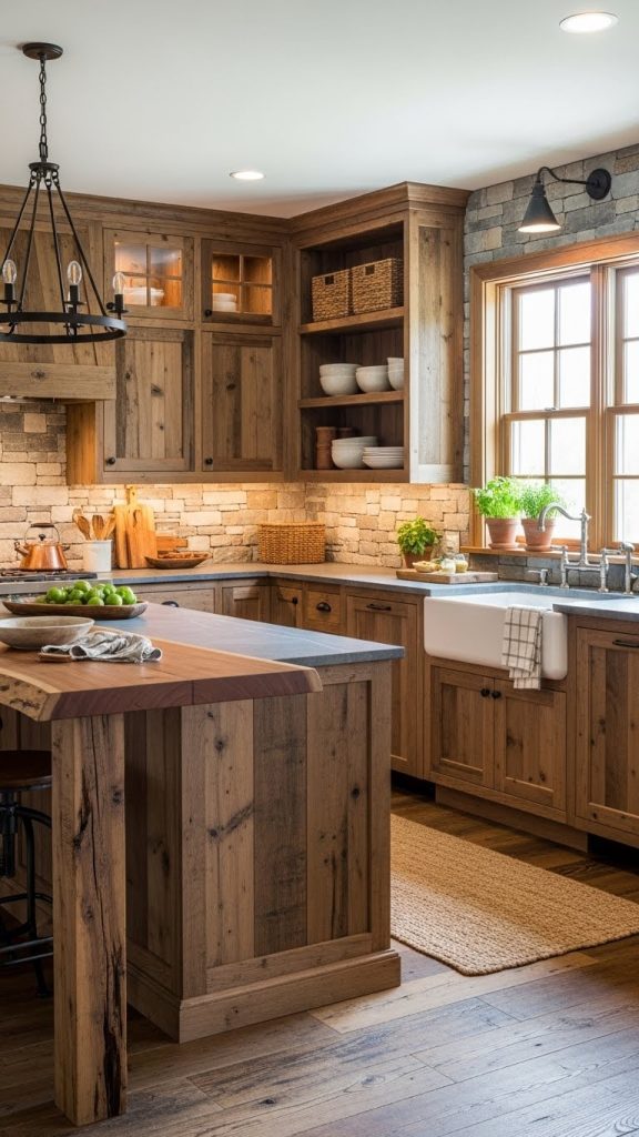 5. Reclaimed Wood Cabinets with Rough Stone Accents