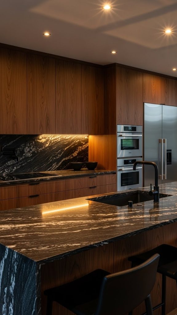 Dark stone countertops or floors paired with deep-toned wood create a luxurious kitchen. Materials like black granite, soapstone, or dark slate are commonly used.