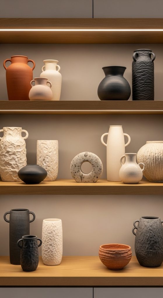 Stone and ceramic decor pieces bring earthy, raw texture to your interior. Items like ceramic vases, stone sculptures, terrazzo decor, and textured pots add weight and substance to a space. Preparing to use these materials involves selecting pieces that complement your room’s palette and style. Natural stones like marble or travertine introduce luxury and sophistication, while ceramics offer handmade charm. Place these textured elements on shelves, coffee tables, or countertops to add depth. Stone decor pairs well with soft fabrics and wooden accessories, creating a balanced and harmonious space. Maintenance is easy and typically requires only wiping with a damp cloth. Stone and ceramic elements elevate your decor by adding tactile richness and natural beauty.
