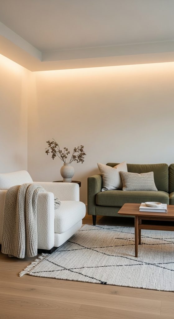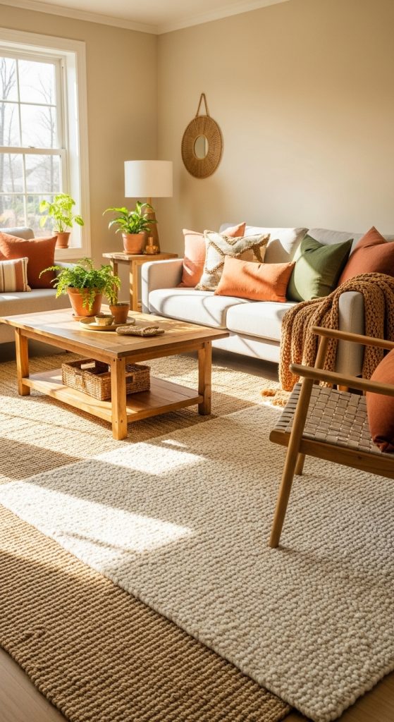 Woven rugs and textured carpets bring warmth, softness, and depth to a room. They also help define spaces, especially in open floor layouts. Textured rugs such as jute, wool, shag, and handwoven designs add a tactile layer that enhances comfort and visual interest. Preparing for this decor idea involves measuring your floor area and choosing a size that fits properly beneath furniture. For example, living room rugs should ideally extend under the front legs of sofas and chairs. Consider the room’s color palette and select a rug that either blends with or contrasts the flooring. Woven materials like jute and sisal bring an earthy and natural feel, while wool rugs offer plush comfort and warmth. Textured rugs work in bedrooms to soften the space and in dining areas to add grounding. To maintain them, vacuum regularly and rotate the rug to ensure even wear. Choosing the right texture not only improves comfort but also enhances the layered appearance of the interior.