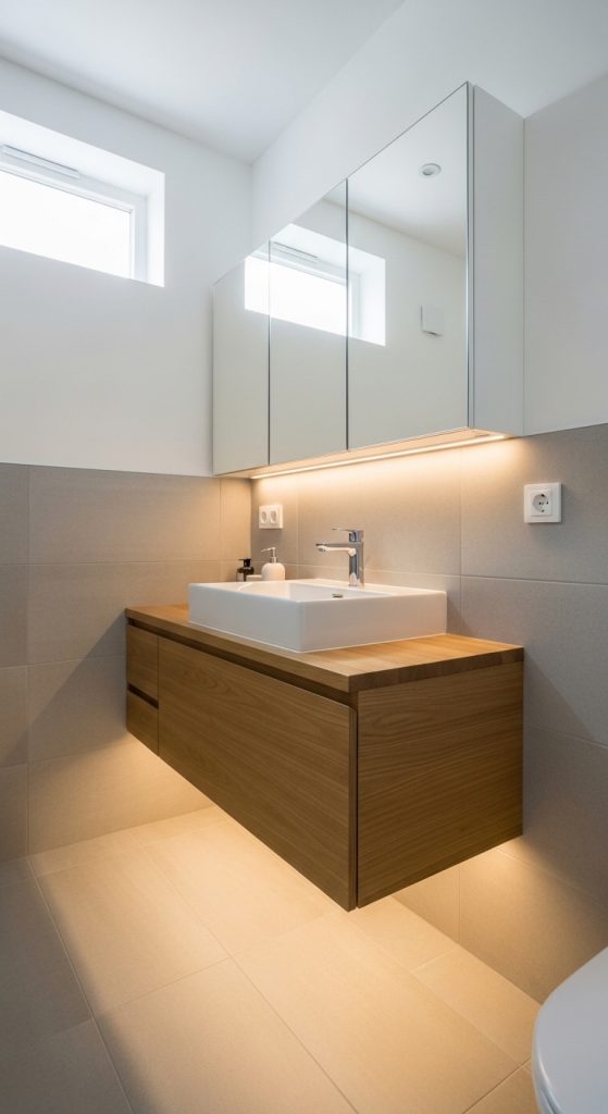 A floating vanity combines modern style with practical functionality, making it an ideal choice for tiny bathrooms.