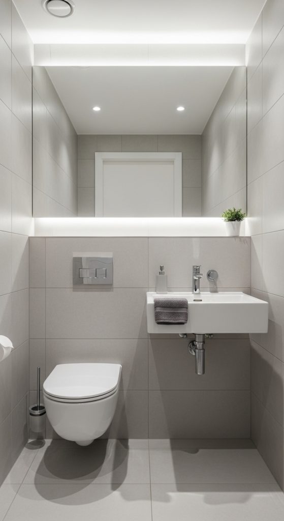 Mirrors play a powerful role in making a small bathroom appear bigger. A large mirror reflects light and visually expands the room, creating the illusion of more space.