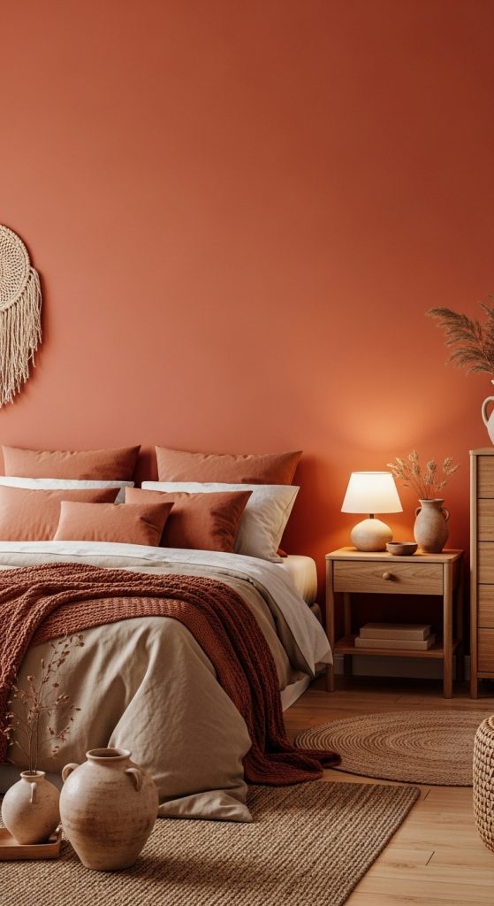 Terracotta brings a deep, earthy charm to any warm tone bedroom. Its bold warmth adds richness without being overwhelming. You can incorporate terracotta in several ways, such as accent walls, throw pillows, planters, lamps, vases, or bedding. Before choosing terracotta decor, evaluate the natural lighting in your room. Terracotta looks stunning in spaces with warm sunlight, but even in dimly lit rooms, it creates cozy depth. If you decide on a terracotta feature wall, ensure you prepare the surface properly, using primer and high quality paint to achieve smooth coverage. Terracotta textiles like throws and blankets also add comfort and layered texture. Pairing terracotta with beige, cream, and brown tones creates a harmonious palette. To avoid overpowering the space, balance terracotta with lighter elements. Natural materials like clay pots and ceramic decor naturally complement terracotta and reinforce the earthy atmosphere. Terracotta accents create a warm, grounded bedroom environment that feels inspiring and welcoming.