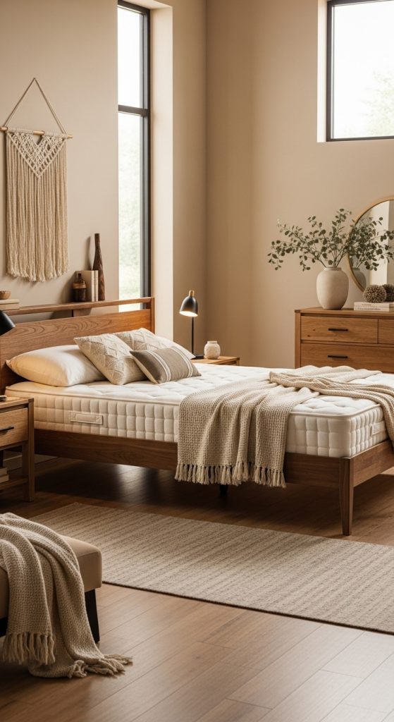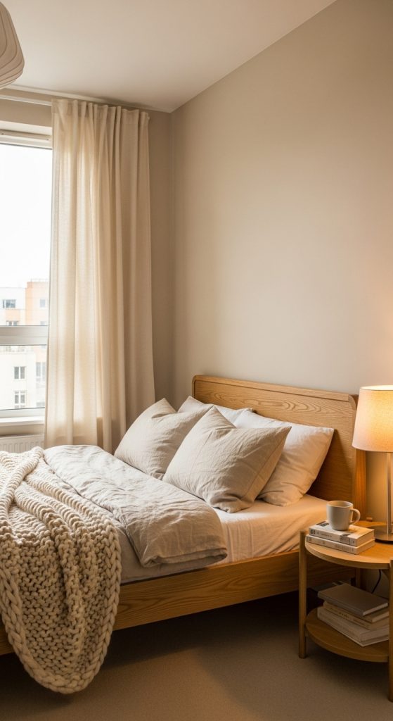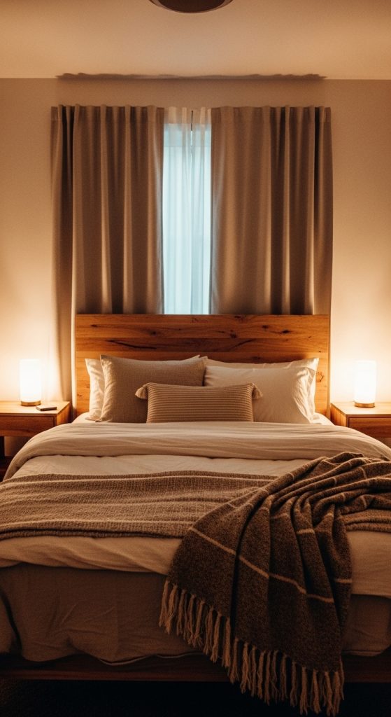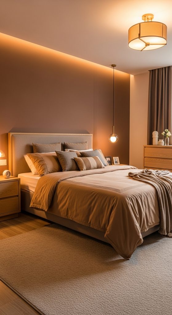 Warm beige walls are one of the simplest yet most transformative ways to introduce a cozy atmosphere to your bedroom. Beige offers warmth without overpowering the space, making it ideal for all room sizes. When preparing for this design approach, begin with selecting the right paint finish. Matte finishes create a soft, velvety look, while eggshell offers slight sheen and durability. Make sure the surface is clean and sanded before applying primer to ensure smooth coverage. Beige works well with natural light, giving the room a golden glow during the day and a calm, muted tone at night. To enhance the warm effect, pair beige walls with earthy toned bedding and wooden accents. Beige also acts as a versatile backdrop, allowing you to incorporate multiple layers of textures, patterns, and shades. Consider pairing it with cream curtains, caramel rugs, or bronze accessories. Beige walls create a balanced and soothing environment, ideal for restful sleep and everyday comfort.