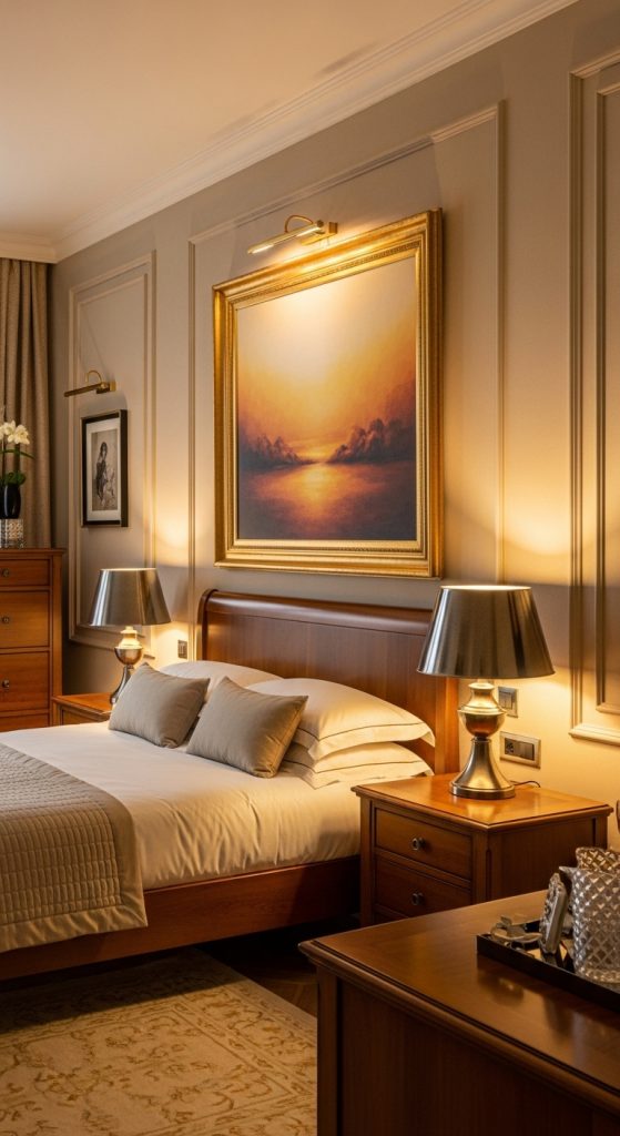 Warm metallic accents such as gold, bronze, and brass add a soft shine to your bedroom without overpowering the warm tone aesthetic. These metals complement earthy colors and enrich the overall look. Consider adding metallic picture frames, bedside lamps, drawer handles, mirrors, or decorative bowls. Preparation includes ensuring the finishes match or complement one another to avoid visual clutter. Warm metallics pair beautifully with beige, cream, mocha, and wooden textures. Metallic accents work especially well in bedrooms that have minimal color variations, as they bring sophistication. When using warm metals, avoid high gloss finishes and instead choose brushed or matte versions for a refined look. These accents reflect light subtly, enhancing the layered lighting in your bedroom. With careful placement, warm metallics create depth, elegance, and a gentle glow within your space.
