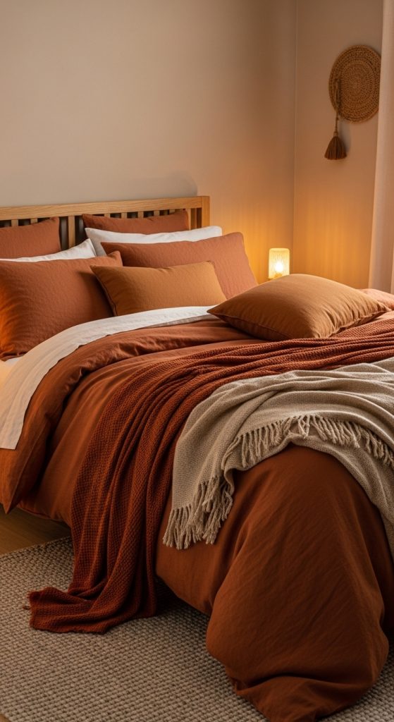 Textiles are one of the most effective ways to introduce warmth and texture to your bedroom. Warm tone textiles such as rust colored blankets, caramel cushions, cream throws, and terracotta bedding add instant coziness. Before purchasing textiles, assess the color palette of your walls and furniture to ensure harmony. Preparation involves choosing fabrics that provide comfort and longevity. Cotton, wool, velvet, and linen are excellent choices. Layering textiles creates depth and a luxurious feel. Consider mixing patterns subtly to avoid overwhelming the space. Warm neutral rugs can anchor the room while softening the floor. Curtains in warm tones also help control lighting and add softness to the walls. Choose textiles that are easy to clean and maintain, especially in bedrooms where daily use is high. With thoughtful selection, warm tone textiles can define your bedroom aesthetic and enhance relaxation.