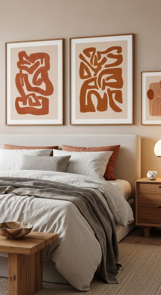 Artwork and wall decor significantly influence the warmth of your bedroom. Choose pieces that include warm shades like terracotta, gold, caramel, beige, and brown. Preparation involves selecting art that complements the existing color palette and enhances the overall aesthetic. You can opt for canvas art, framed prints, woven wall hangings, or wooden wall decor. Before installation, plan the layout to maintain visual balance. Warm toned artwork adds personality and depth to the bedroom. Handmade pieces or textured art can amplify the cozy feeling. If you prefer a minimalist approach, choose one large warm toned artwork above the bed. For a more decorative look, create a gallery wall using coordinated warm colors. Wall decor should reinforce the warmth without overcrowding the space. With thoughtful selection and arrangement, warm artwork can tie together all elements of your warm tone bedroom.